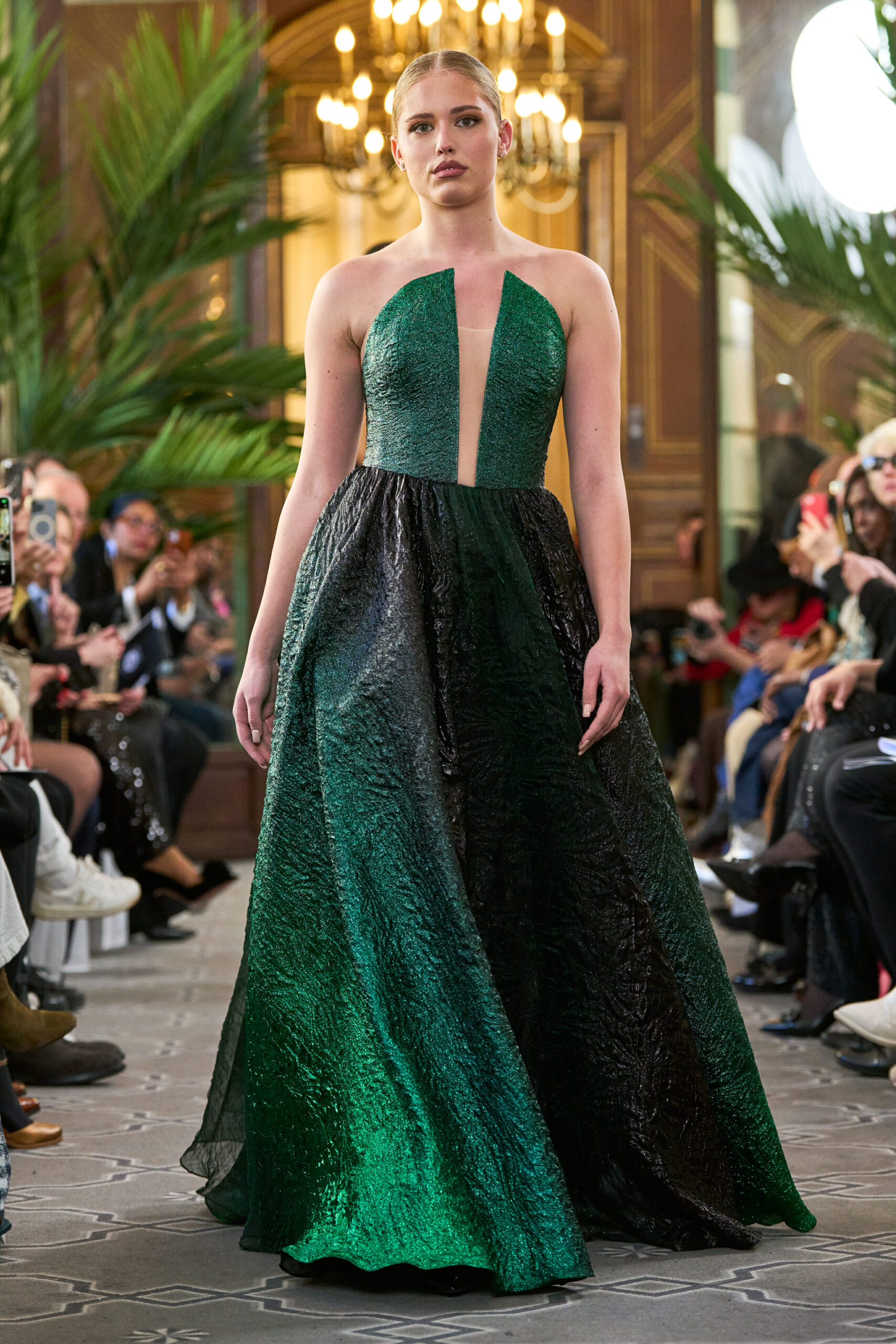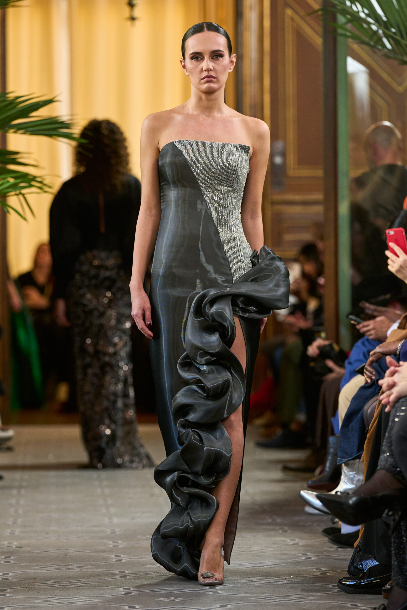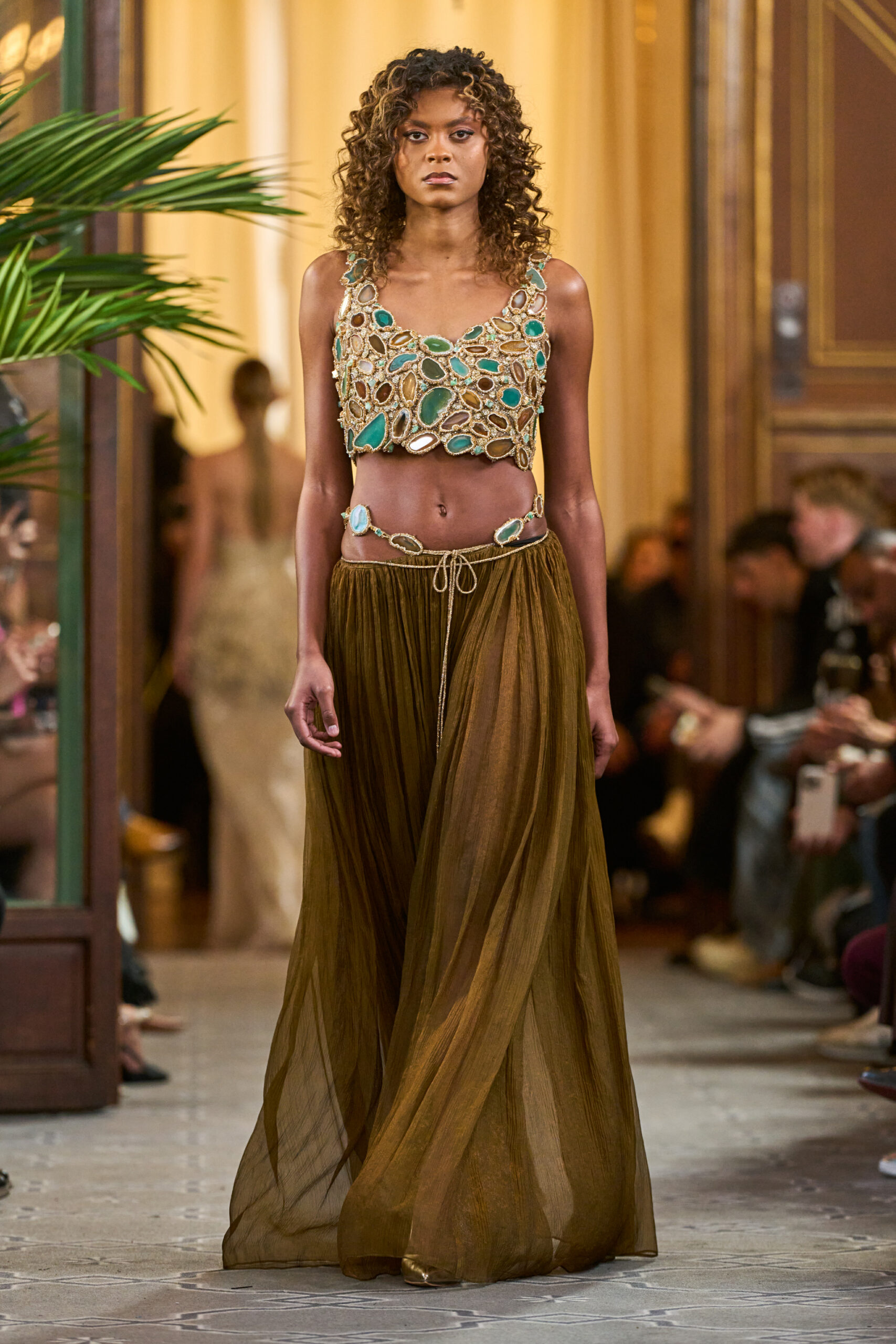 « Cette collection « Artisan Allure » est ma façon de transformer des souvenirs d’enfance en art vivant”, explique Houida. La nacre, autrefois sertie en mosaïque, scintille désormais sur le tissu. Les motifs de vitrauxdes maisons historiques prennent une nouvelle forme dans des matériaux rayonnants. Le cuir, façonné en silhouettes audacieuses, est orné de détails sculpturaux inspirés des sculptures sur pierre anciennes. Les pierres précieuses font harmonieusement fusionner couture et haute joaillerie. Chaque pièce reflète l’âme de l’artisanat traditionnel réinventé à travers une lentille contemporaine. Cette collection n’est pas seulement de la mode : c’est une célébration de l’histoire, du talent artistique et de l’esprit durable de l’excellence faite à la main.