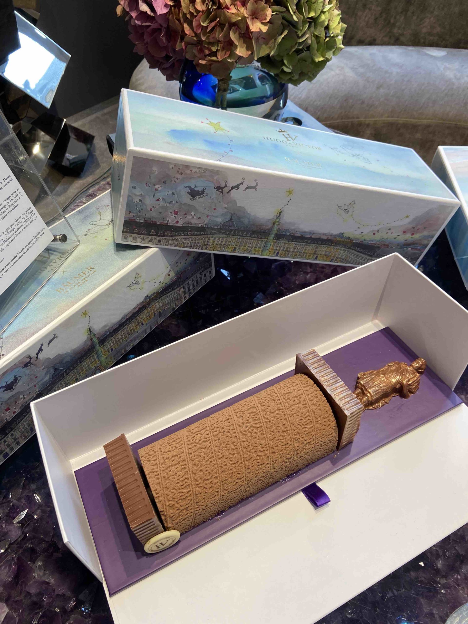 Association Hugues Pouget et la maison Bäumer pour la bûche ‘Vendôme’ qui reprend la colonne de cette même place où se situe la boutique de joaillerie.