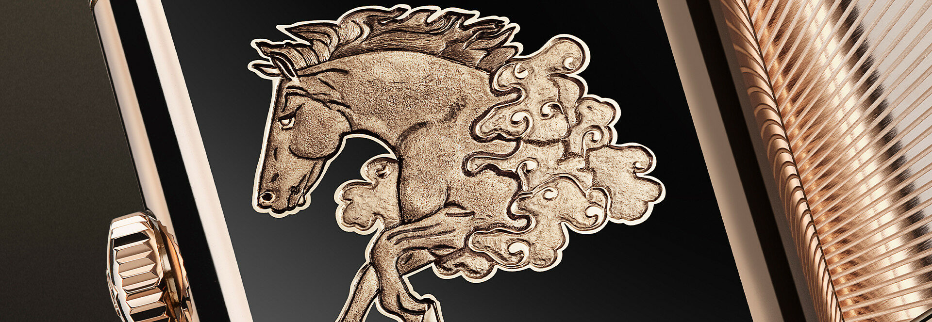 Devenant une œuvre à part entière, le cheval orne désormais le fond de la Reverso avec sa crinière au vent, sa tête et ses jambes semblant jaillir de nuages dorés.