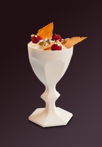 Un verre mythique et une icône pour Baccarat, le verre Harcourt, repris à la carte de la Cristal Room en un dessert signé David Daoulan. L’intérieur du verre est délicieux : fraise des bois, vanille, pistache coco vanille en une combinaison de diverses textures (crème, moelleux, glace, caramel) ; la coque est hélas en chocolat blanc et obligatoirement très épaisse. Au final, le dessert est bien plus esthétique que bon !