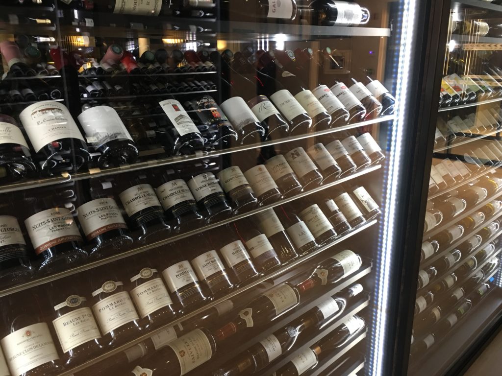 Difficile de vous évoquer les vins : j’étais invitée par un « charmant » qui m’a offert deux coupes de Laurent Perrier !! Mais à l’entrée du restaurant, des vitrines transparentes laissaient entrapercevoir quelques beaux flacons.