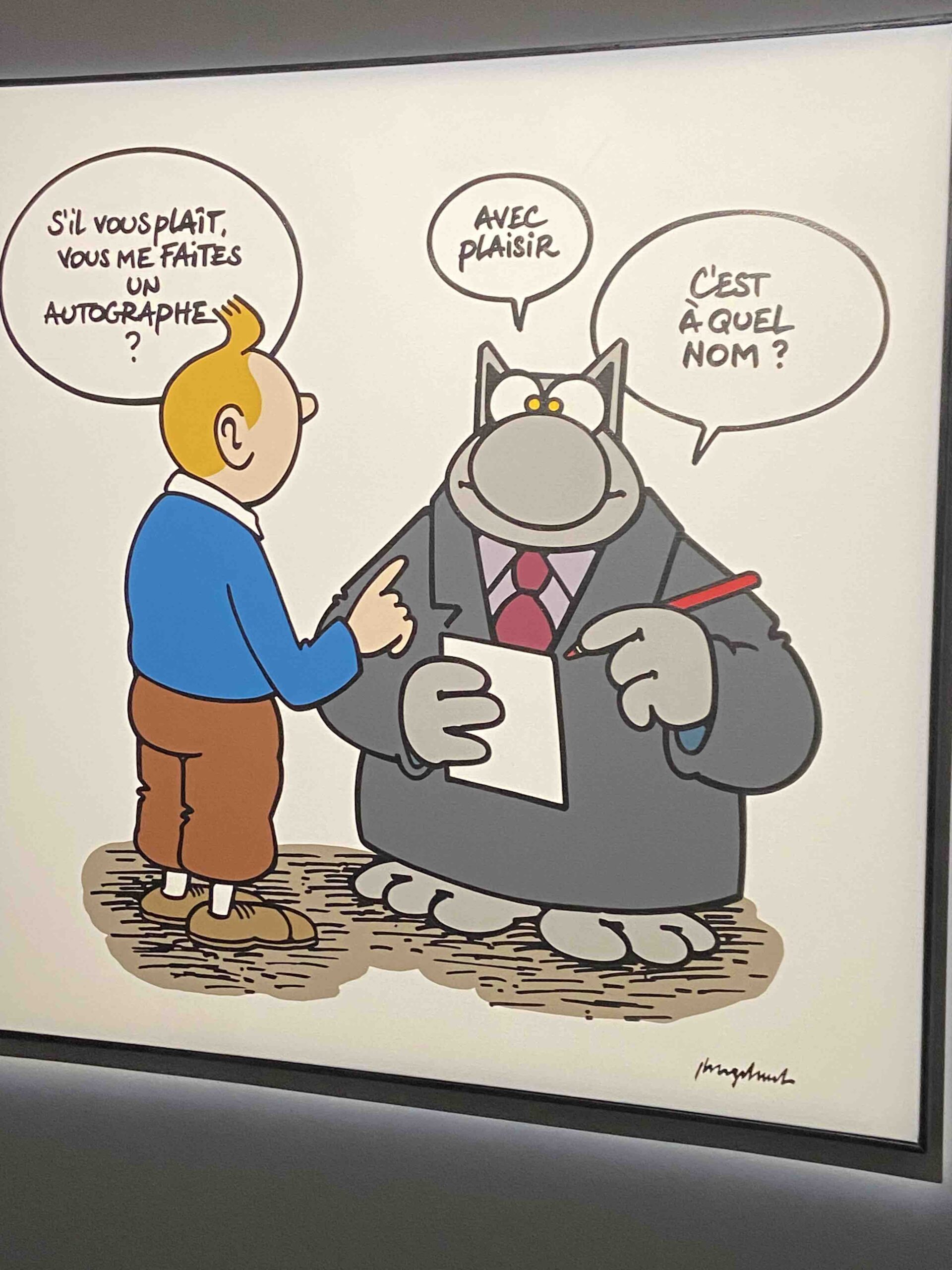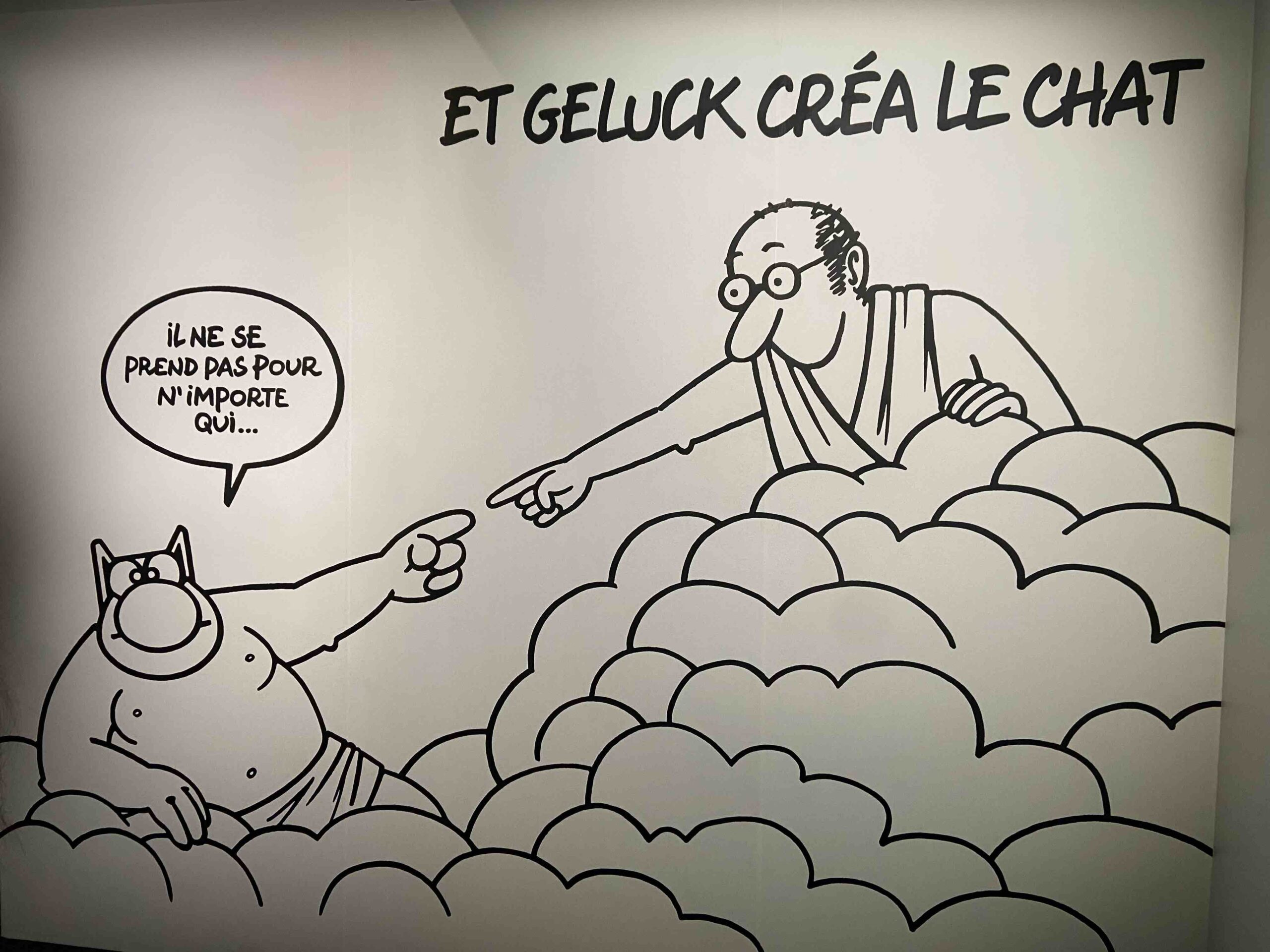 C’est un comble : il a fallu que, de Bruxelles où j’étais ces derniers jours, je fasse un aller et retour à Paris pour voir l’exposition du plus belge des dessinateurs belges : Philippe Geluck sur son chat !