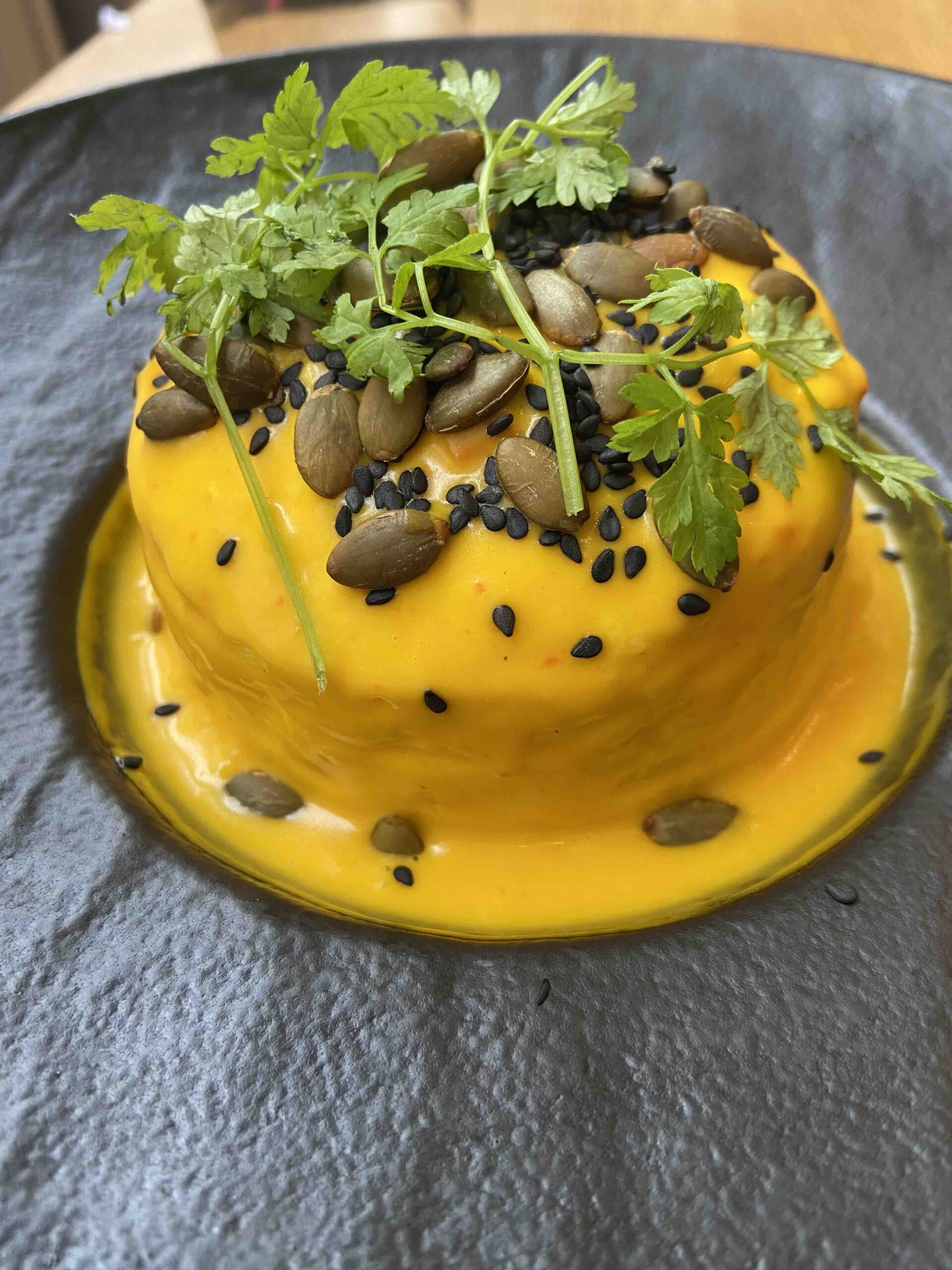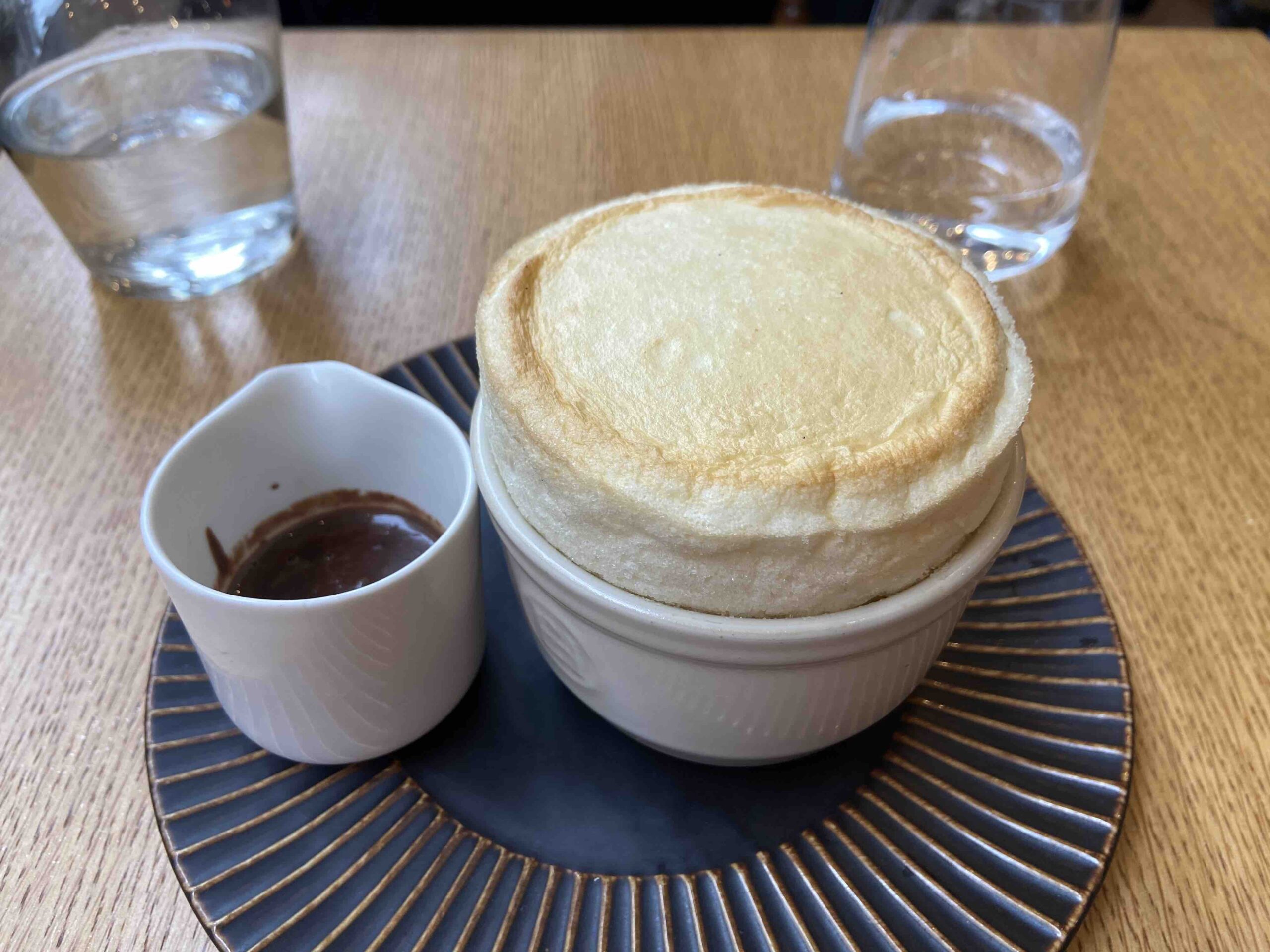 Trève de miaulements gratifiants, il fallait quand même nourrir la bête !! Alors traînant dans le quartier j’ai découvert un petit restaurant où le soufflé est roi et bien m’a pris d’y aller déjeuner. La formule à 25 € pou 2 soufflés, un au potimarron et un autre vanille sauce chocolat, rassasie les mammifères de tout poil ! Délicieux et à la carte, d’autres soufflés existent : au fromage bien sûr, à la volaille, au foie gras et artichaut, au Grand Marnier, aux noisettes.