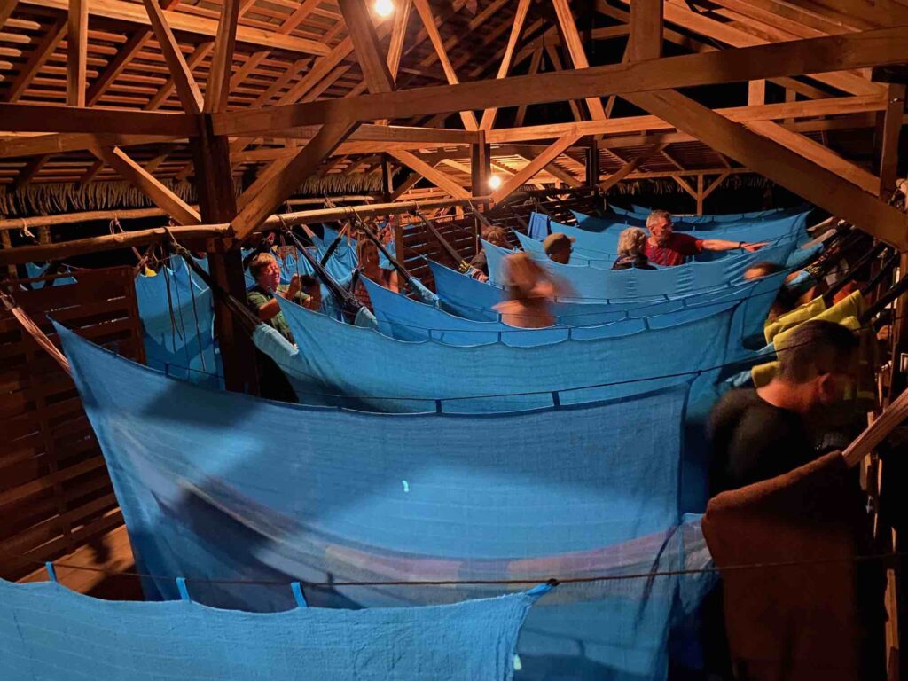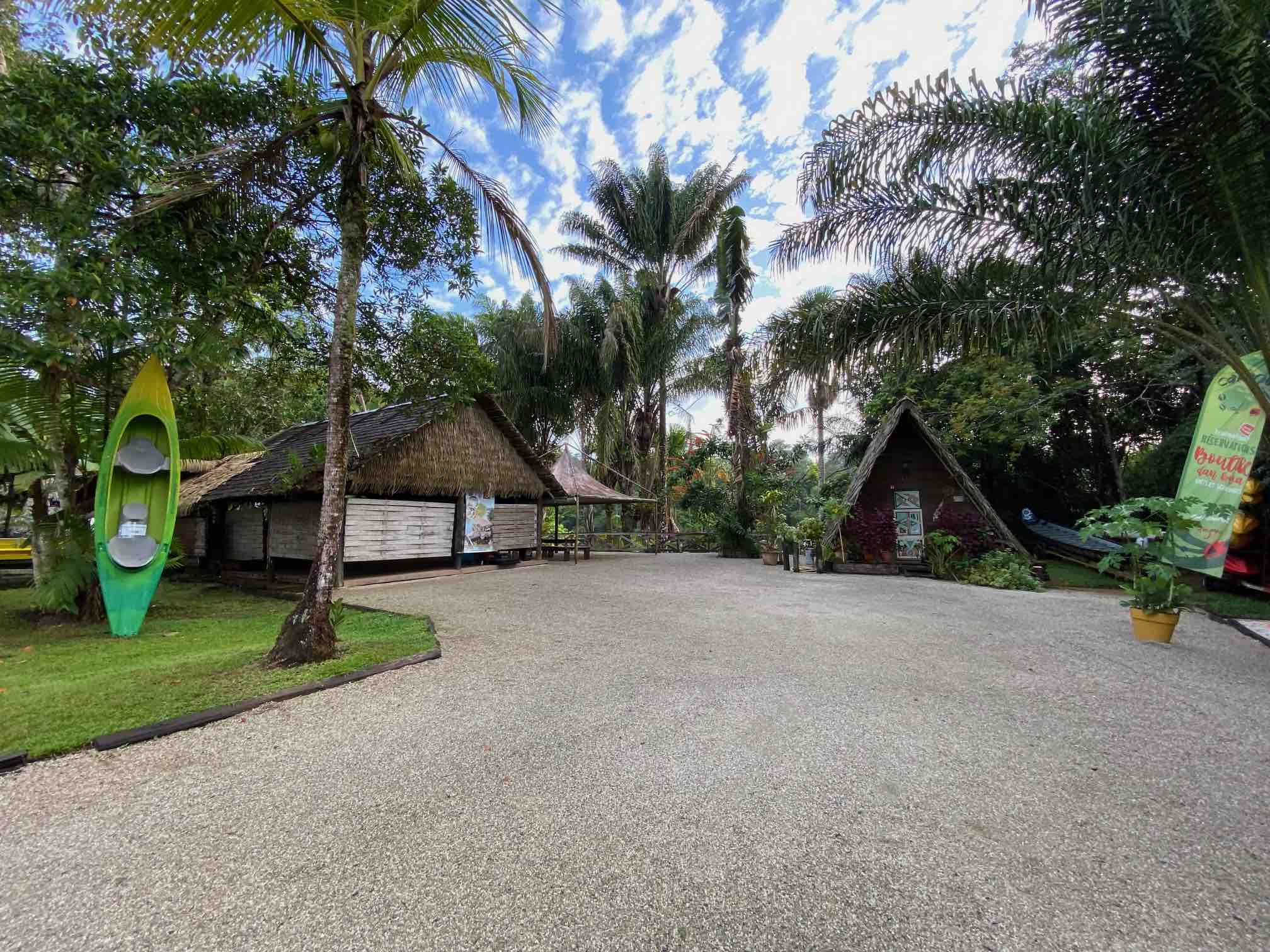 Au cœur d’une végétation luxuriante, émerge le toit d’un grand carbet, un de ces abris constitués d’une couverture de palmes posée sur 4 ou 8 poteaux et ouvert à tous les vents … et tous les visiteurs nocturnes. Juste avant de descendre du car, on nous a raconté que la nuit, les habitants rentrent leurs car les jaguars en raffolent ! Un frisson parcoure notre équipée…Le jaguar est susceptible de roder autour de notre campement ? Ce reportage en Guyane s’annonce « aventureux ». La nouvelle et les bruits de la nuit nous font taire, brièvement, car la découverte des hamacs suspendus suscite l’ébahissement du groupe. La plupart n’ont jamais passé une nuit en hamac…