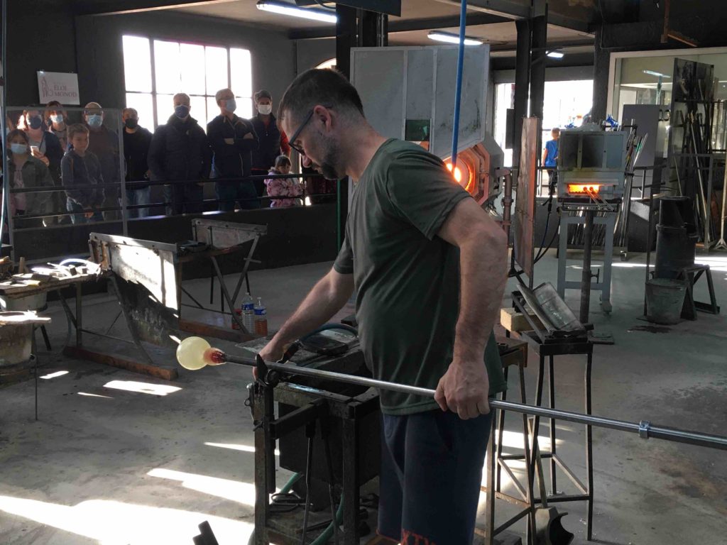 Sous un grand hangar, vous verrez les souffleurs de verre et vous pourrez vous imprégner un peu de cette magie qu’est le verre en fusion, le voir s’arrondir, puis s’allonger au bout de la canne pour devenir un vase ou un cruche. Et cela est bien de magie qu’il s’agit quand on voit les maîtres verriers (3 travaillaient lors de ma venue en un ballet incessant entre les fours, les enclumes, les pinces métalliques) prélever dans le four un peu de pâte de verre rougeoyante, l’aspirer avec sa canne en verre et la modeler comme d’autres malaxent de la pâte feuilletée pour créer un modèle ; enfin emprisonner entre 2 couches de verre des bulles, spécificité unique de cette verrerie.