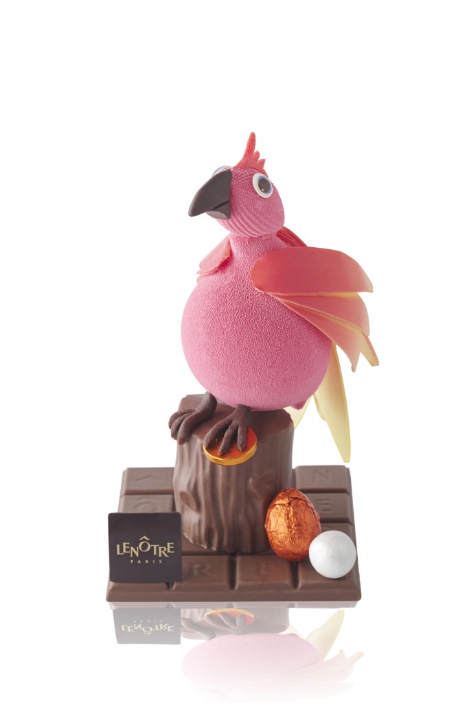 Avec leur bec rose, vert ou bleu ; les coucous qui annoncent le printemps viendront sonner le coup de midi pour le repas pascal. L’ois’œuf existe en chocolat noir de Madagascar à 72 % ou lait à 43 % et mesure 20 cm de haut.
