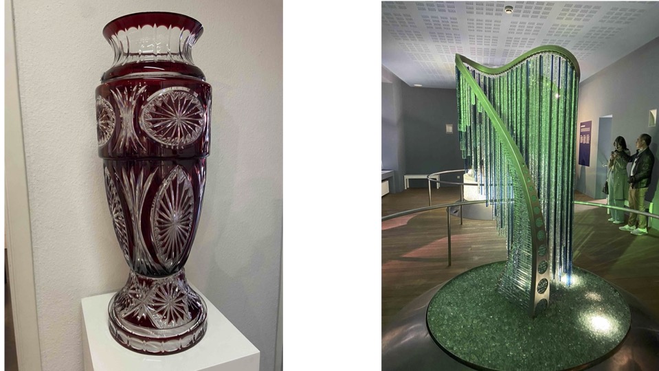 De vitrine en vitrine, les œuvres provenant tant de collections privées que publiques, jalonnent les différentes facettes de la production cristallière. Vases, verres, objets décoratifs affichent leur pureté translucide ou jouent des couleurs rouges, bleues iconiques de la cristallerie.