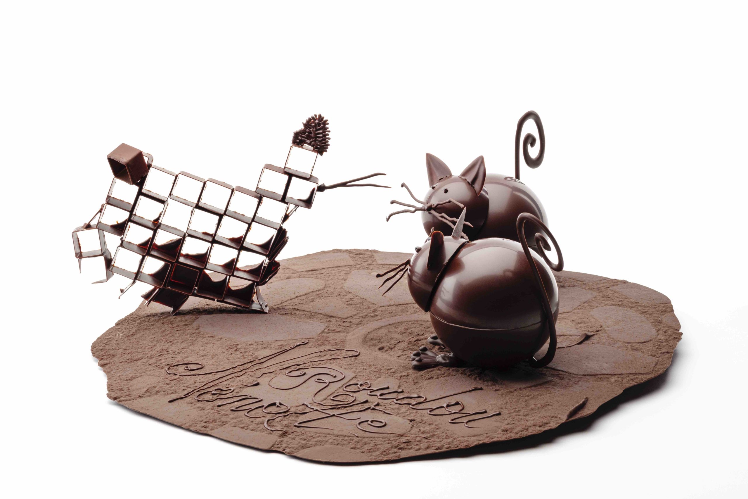 Connexion gourmande entre le chef de la création Lenôtre Guy Krenzer, le chef chocolatier Marc Sibold et le pâtissier MOF Jean Christophe Jeanson : au final 5 animaux malicieux dont un mouton Peluche, une vache Rieuse, un lapin Taquin, un cochon Trompette…