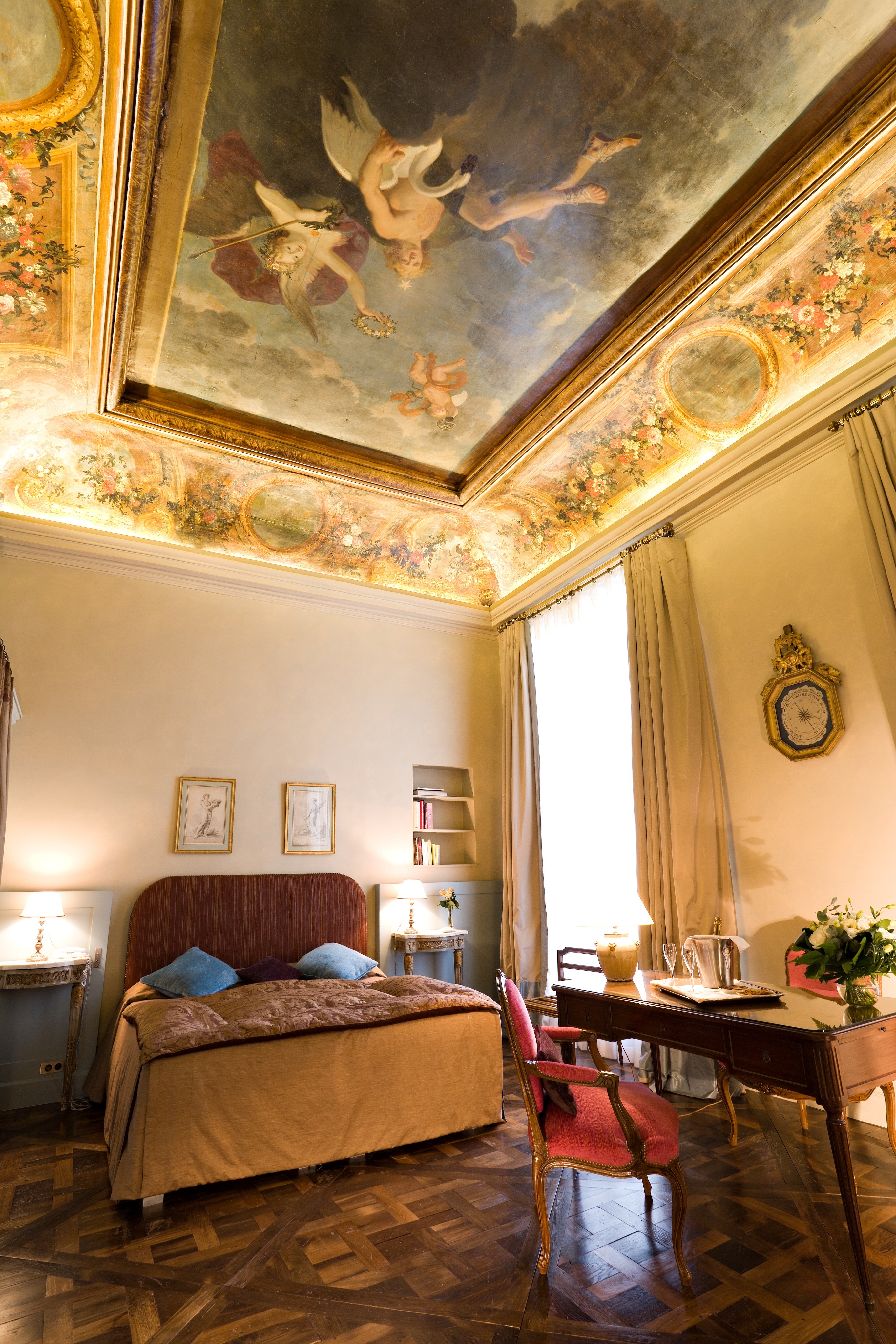 Aux côtés de tableaux de l’école hollandaise et d’un beau Natoire ; la fresque découverte lors de la restauration de 2 chambres a révélé 40 M2 peints en parfait état de conservation. L’œuvre aurait été commanditée en 1666 par le seigneur de Charange, conseiller, maître d’hôtel ordinaire du roi Louis XIV et locataire du 1 er étage de cet hôtel particulier.