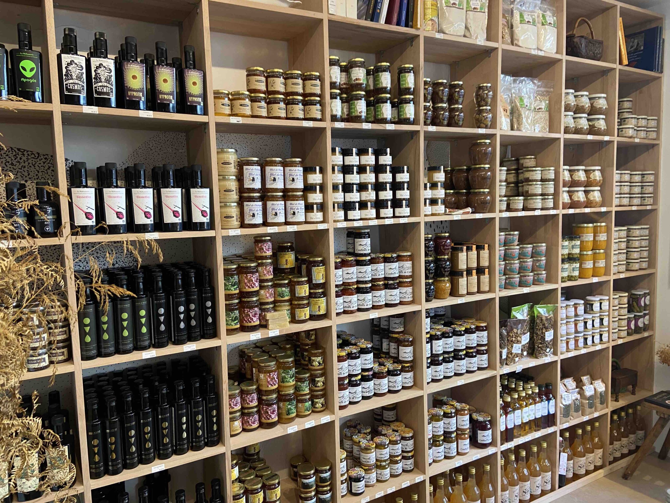 Au-delà du comptoir, une alcôve permet de petits ateliers dégustations pour apprendre à connaître une région riche en produits authentiques. Si vous n’aimez que les courses ultra rapides faites en grande distribution, passez votre chemin : ici on prend le temps de vous faire découvrir et aimer une liqueur de framboises, une huile d’olive, des morilles séchées, un Cornas, une jambonette….