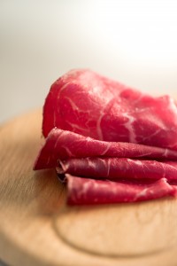 De fines tranches à manger quasiment brut avec une belle couleur rouge vif et quelques points blancs de persillage ! Est ce du jambon pata negra (porc noir espagnol nourri aux glands de chêne) ? Est ce de la viande des Grisons (bœuf suisse séché) ou un carpaccio à l’italienne ?