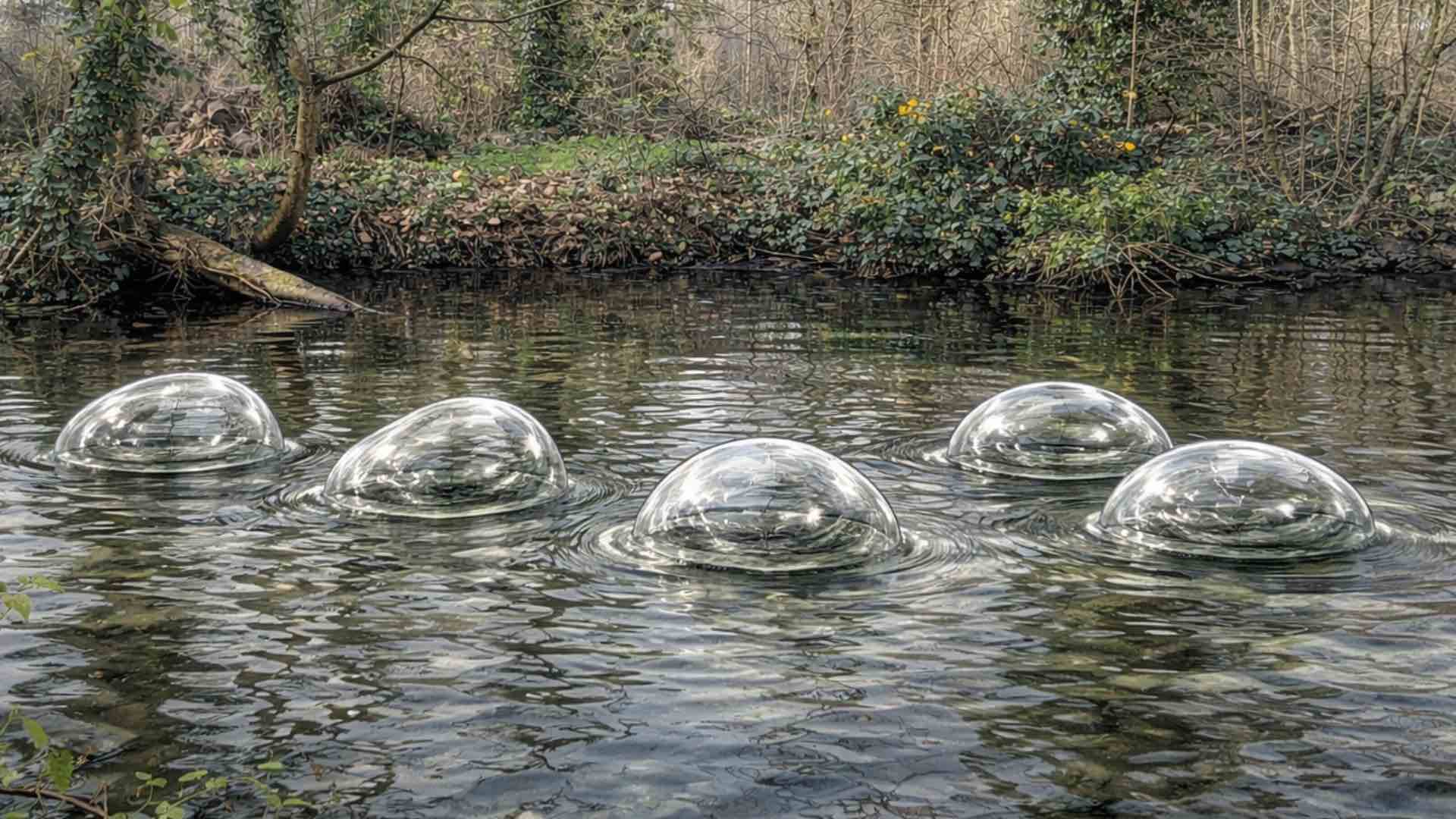La première « Sèves à fleur d’eau » est une installation composée de formes organiques en verre soufflé et les bulles semblent flotter sur l’eau comme si des poissons respirant sous l’eau envoyaient à la surface le souffle de leurs bouches.