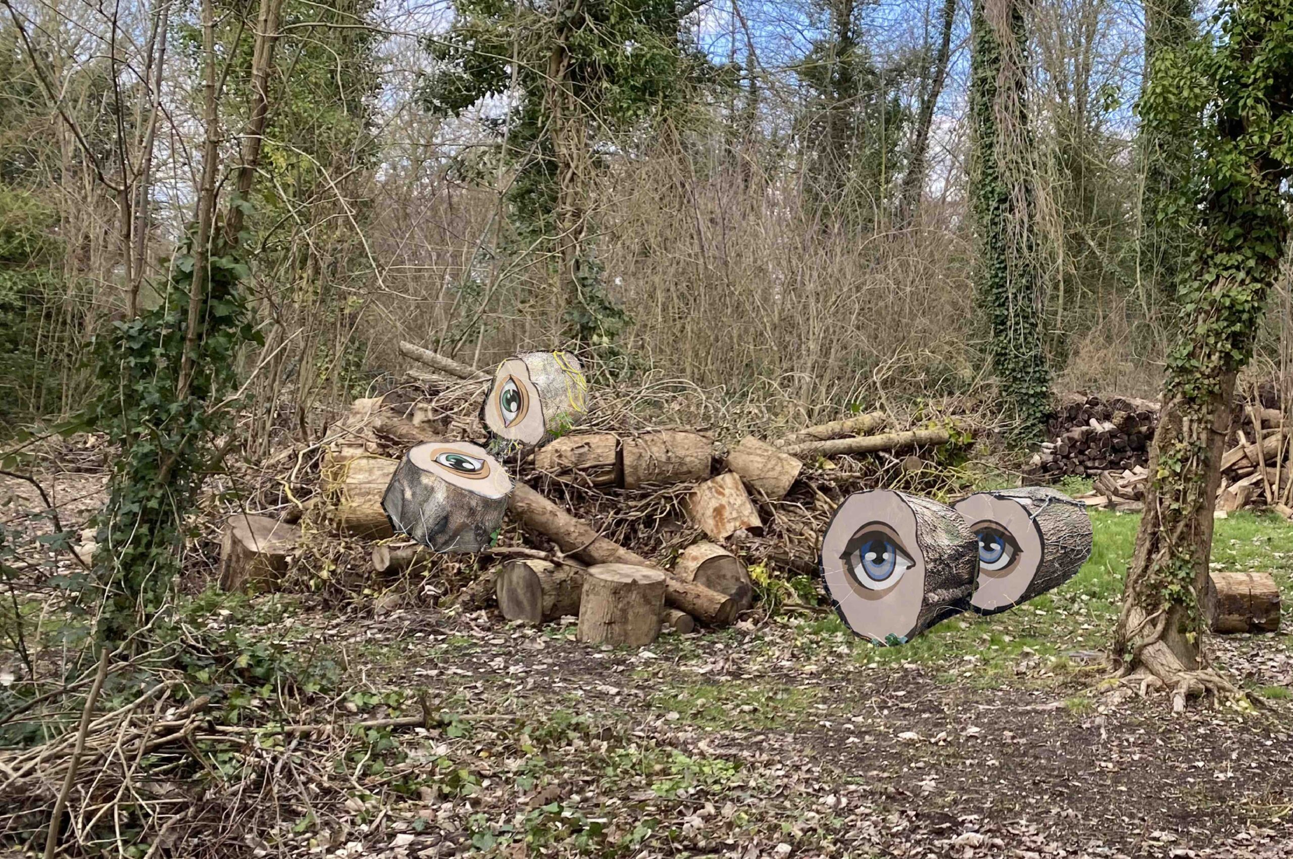 La seconde « Eyes wide cut” est une création de la plasticienne française Emilie Breux qui a créé des œuvres en résonance avec l’histoire de l’Ile aux Fagots, une parcelle où autrefois les bois ramassés étaient liés en fagots avant leur évacuation par l’eau et les hortillons. E. Breux a travaillé avec des arbres tombés naturellement afin de prolonger le geste d’antan sur le bois. De manière inédite, les tronçons de bois sont décorés de grands yeux maquillés ; Et le trouble peut s’installer car on a l’impression que les yeux vous regardent. Les yeux des arbres interrogent le promeneur : êtes-vous là pour nous admirer, par pur voyeurisme ? Troublant jardin que celui-là !!