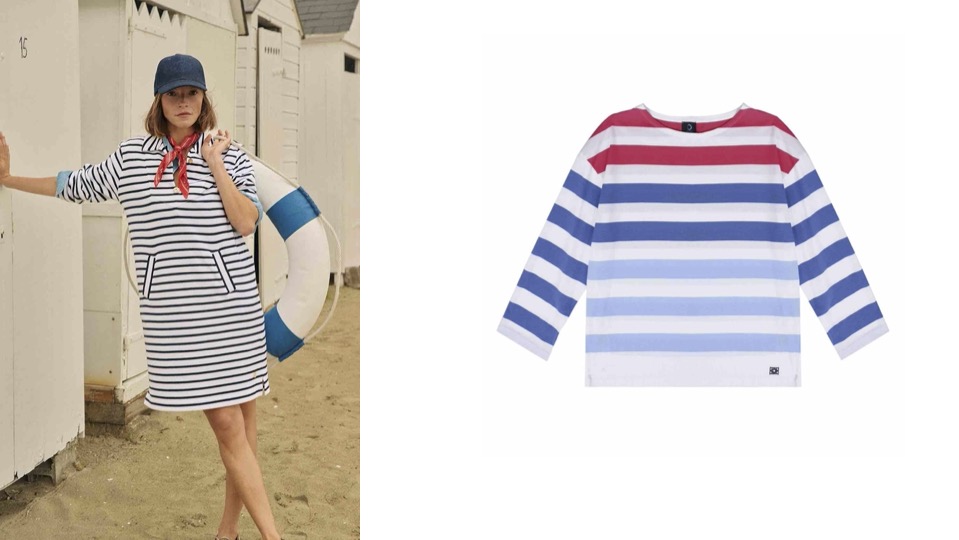 Spécialiste du tricot marin et de la marinière, la rayure fait partie de l’ADN de ce nom français iconique de la laine et du coton et surtout du vêtement plage bateau.