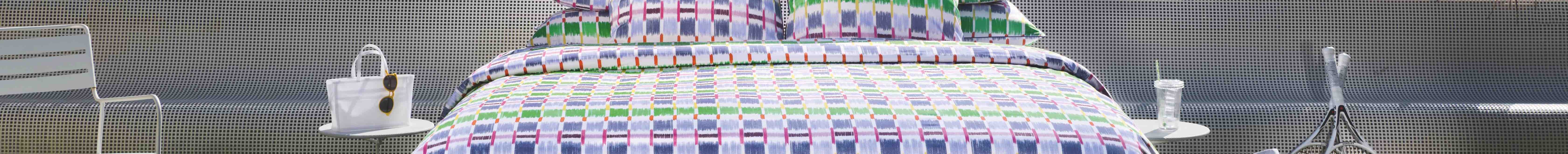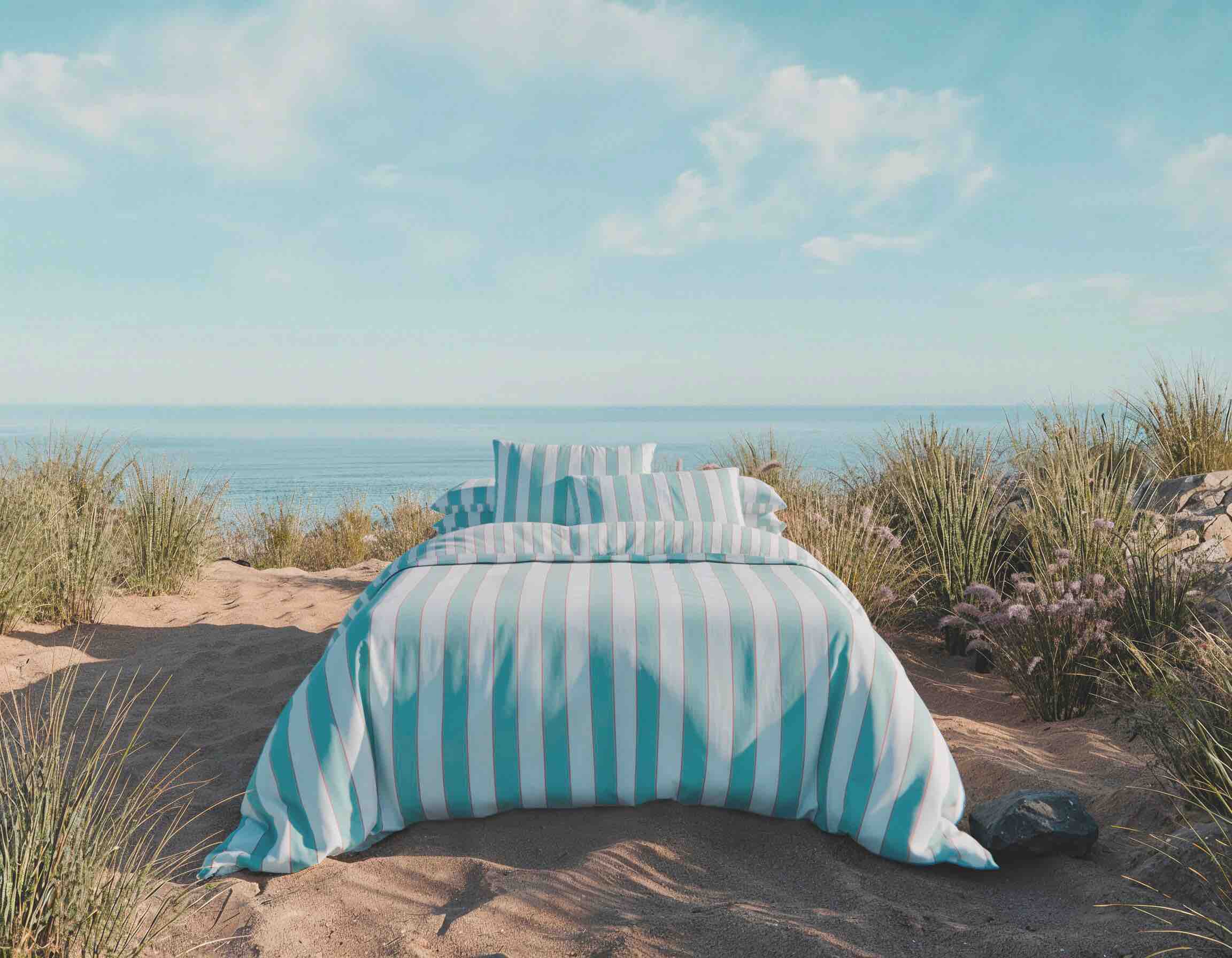 Iconique pour les linges de lit, voici la parure La Cabine d’Anne de Solène avec taie d’oreiller et housse de couette.