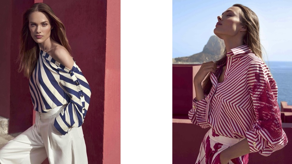 Chemises vaporeuses et fluides oversize pour cette marque avec la blouse bleue et blanche en viscose et soie (185 €) et la rouge et blanc en coton à 170 € ; carolinebiss.com