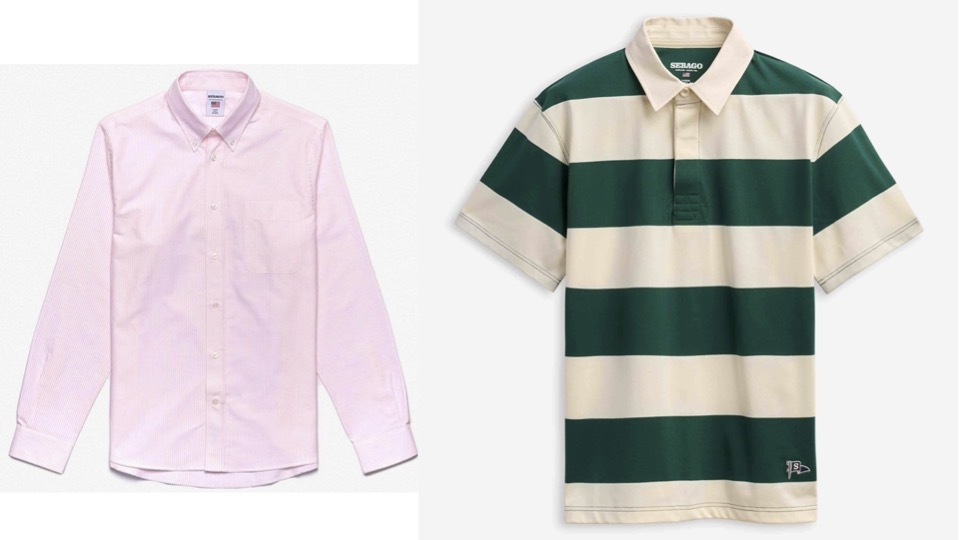 Coton à 100 % pour la chemise rose ’doubling pink white’ à 120 € et le polo ‘LM Campbell white natural green’ à 130 € ; sebago.com