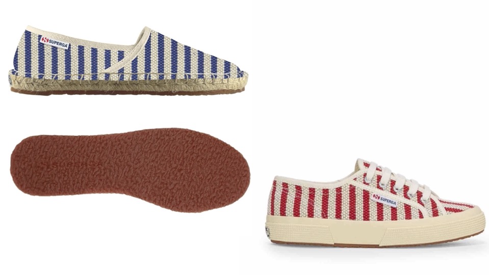 D’un côté les espadrilles ‘blue off white’ qui sont à 100 % en coton ; de l’autre des baskets elles aussi ‘stripes red off white’ mi coton mi caoutchouc pour la semelle.