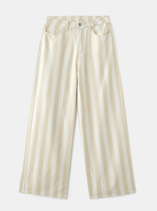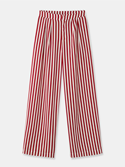 Des pantalons à gogo pour cette marque avec un jean beige taille haute et jambes larges en coton à 100 % (29, 49 €) et un pantalon évasé à rayures rouges et crème.