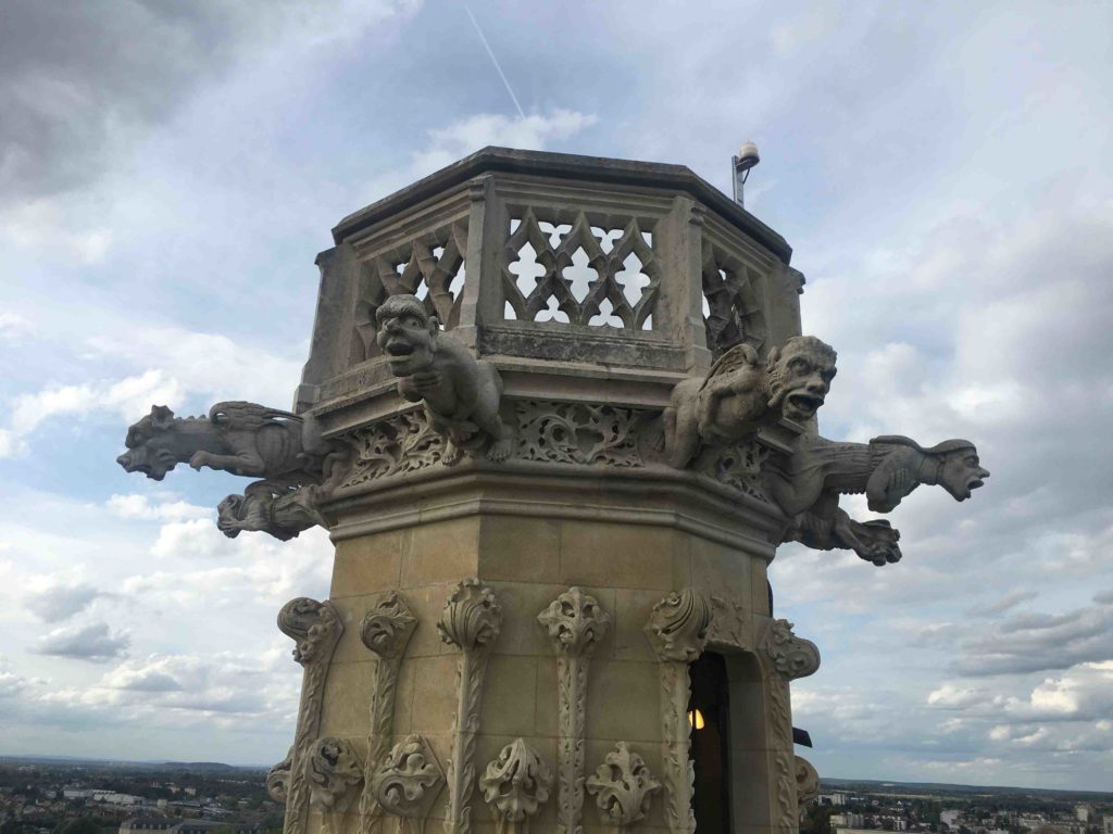 En haut des 52 marches, quel spectacle : entre les faciès rigolos ou fantasmagoriques des gargouilles, une vue à 360 ° sur les alentours de la cité avec les doux méandres de la Loire qui coule en arrondi.