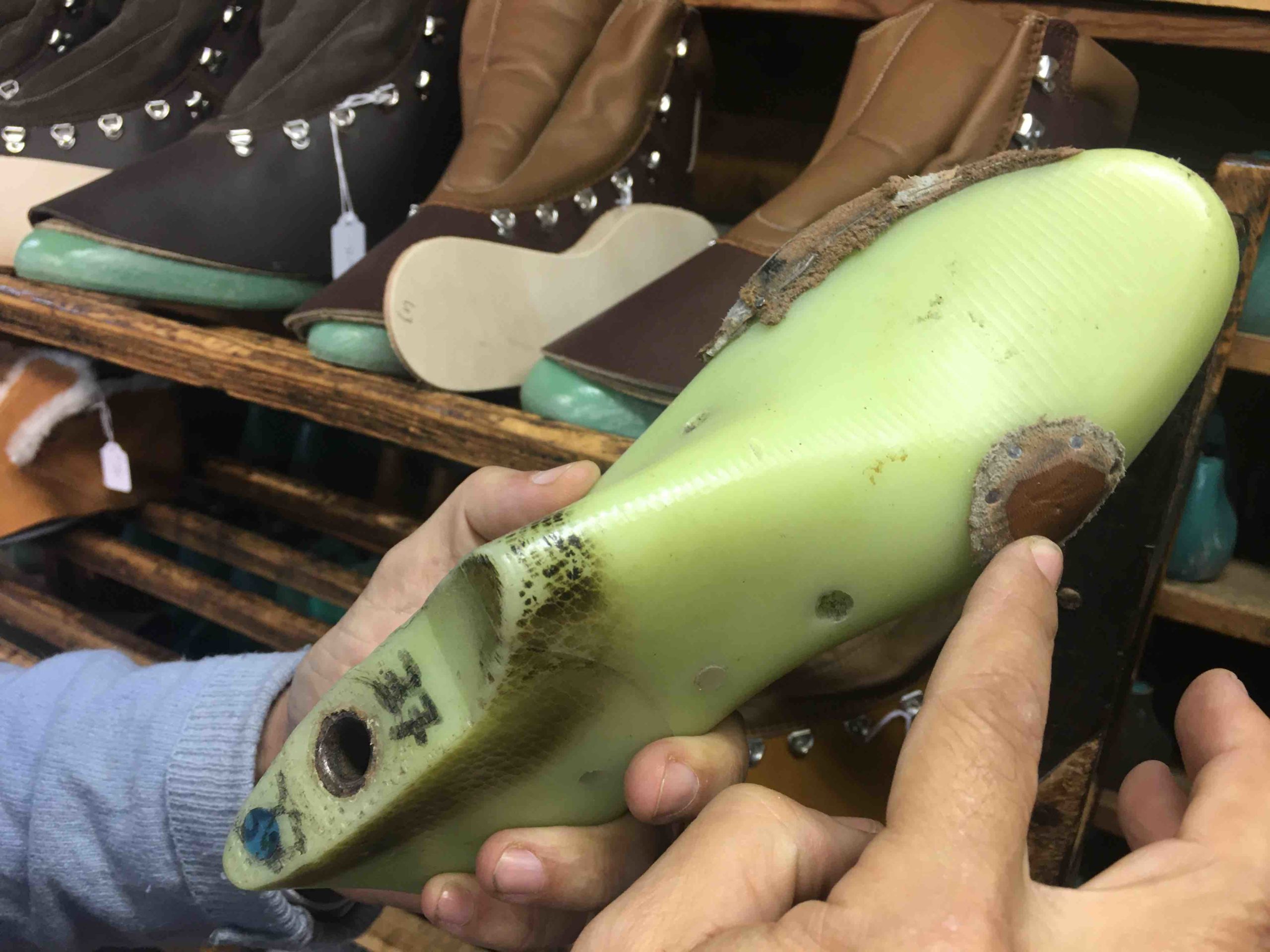 Sur une étagère trônent des embauchoirs et des formes bizarroïdes : normal m’explique Philippe Carrouché. Ici chaque chaussure est personnalisable : idéal donc si vous avez un pied plus fort que l’autre, un hallux valgus et autre misère.