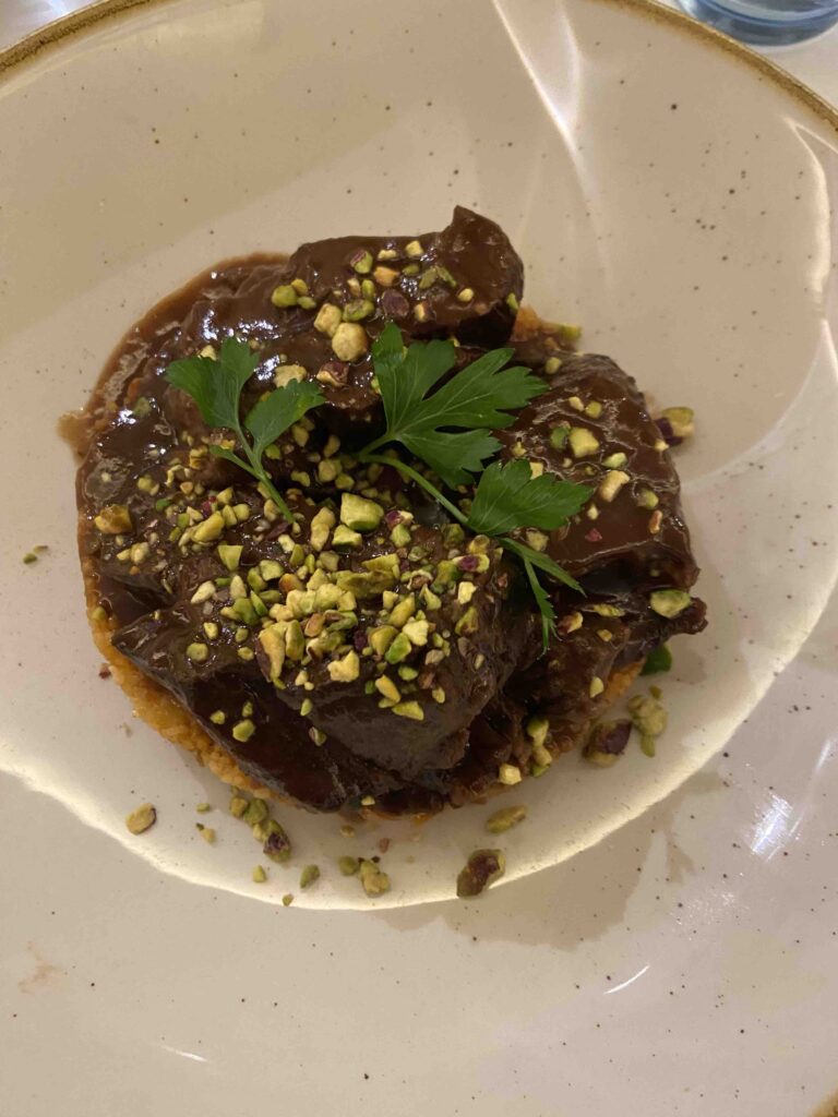En plat principal, la moussaka est incontournable et elle est réussie, car à l’opposé de celles goûtées auparavant. La moussaka d’Osmossi n’est pas grasse, ni suintante de fromage fondu. Elle fleure bon les légumes longuement cuits avec de la viande d’agneau et de veau qui s’interpose entre les couches de courgettes et d’aubergines (25 €). J’ai goûté aussi l’excellente magoulo stifado, une joue de bœuf ultra tendre et cuite lentement avec pistache et raisins (28 €). Nul besoin de couteau pour cette viande-là : elle est tellement tendre qu’une simple fourchette suffit !