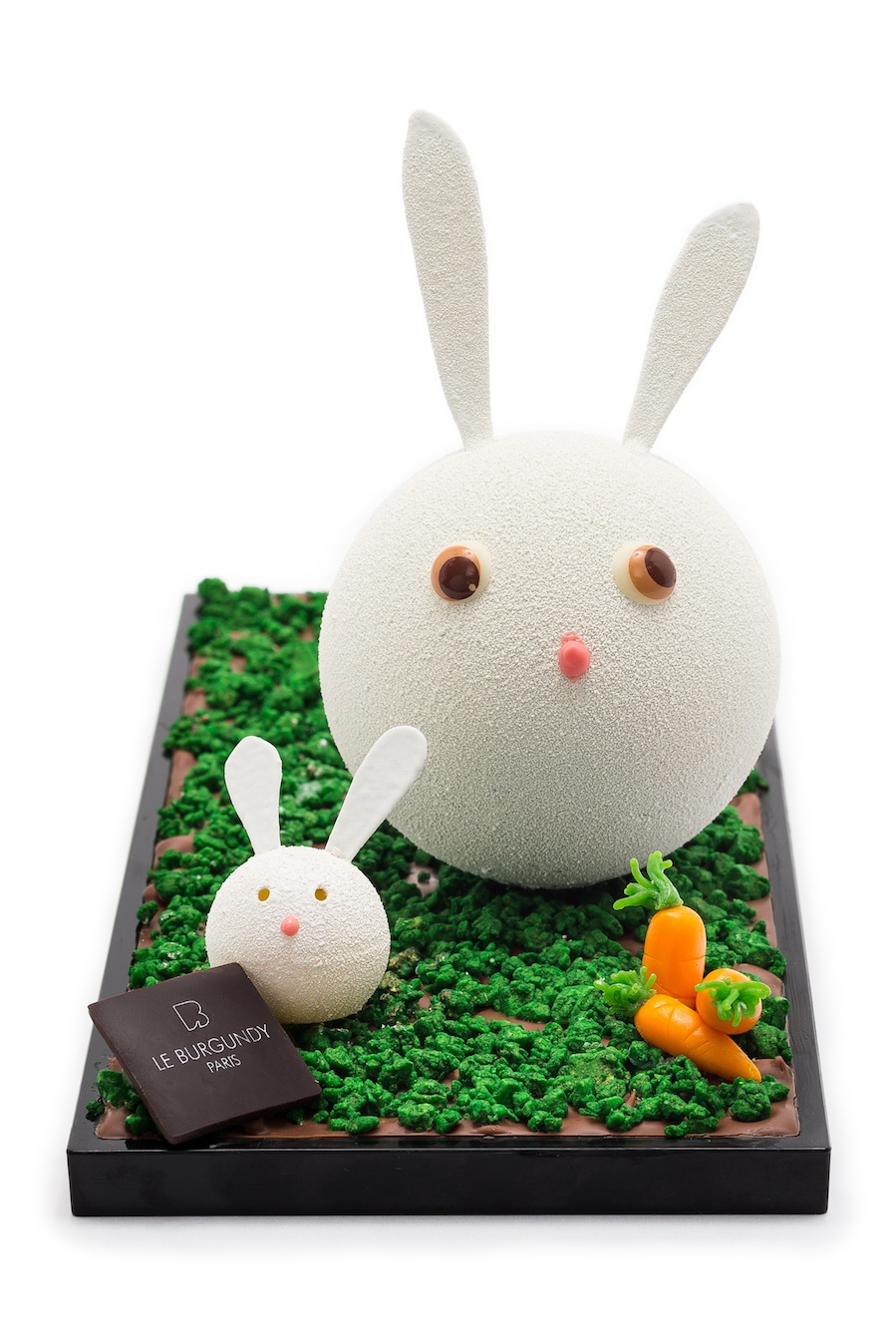 Proche de La Madeleine, le pâtissier du Burgundy emmène une famille lapin au potager. Sur la tablette de chocolat au lait transformée en espace vert, une Maman Lapin en chocolat noir remplie de perles croustillantes et son lapinou en chocolat blanc garni de pralinés. 34 €, sur commande uniquement, 01 42 60 34 12.
