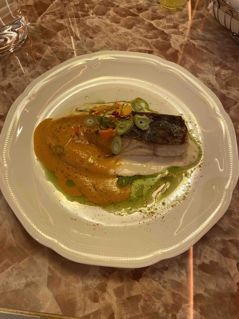 Le jour de mon test les entrées fraîches faisaient hésiter entre saumon mariné aux épices douces et salade César revisitée. Marinade salée-sucrée et au soja pour relever les tranches de saumon et sucrine augmentée de dés de jambon mais assaisonnée de sauce César : telles étaient mes 2 entrées. Mais à la carte vous auriez pu choisir un croque jambon truffé et Beaufort (16 €), un carpaccio de daurade condiment d’avocat (16 €) ou un foie gras chutney de mangue et brioche toastée (25 €).
