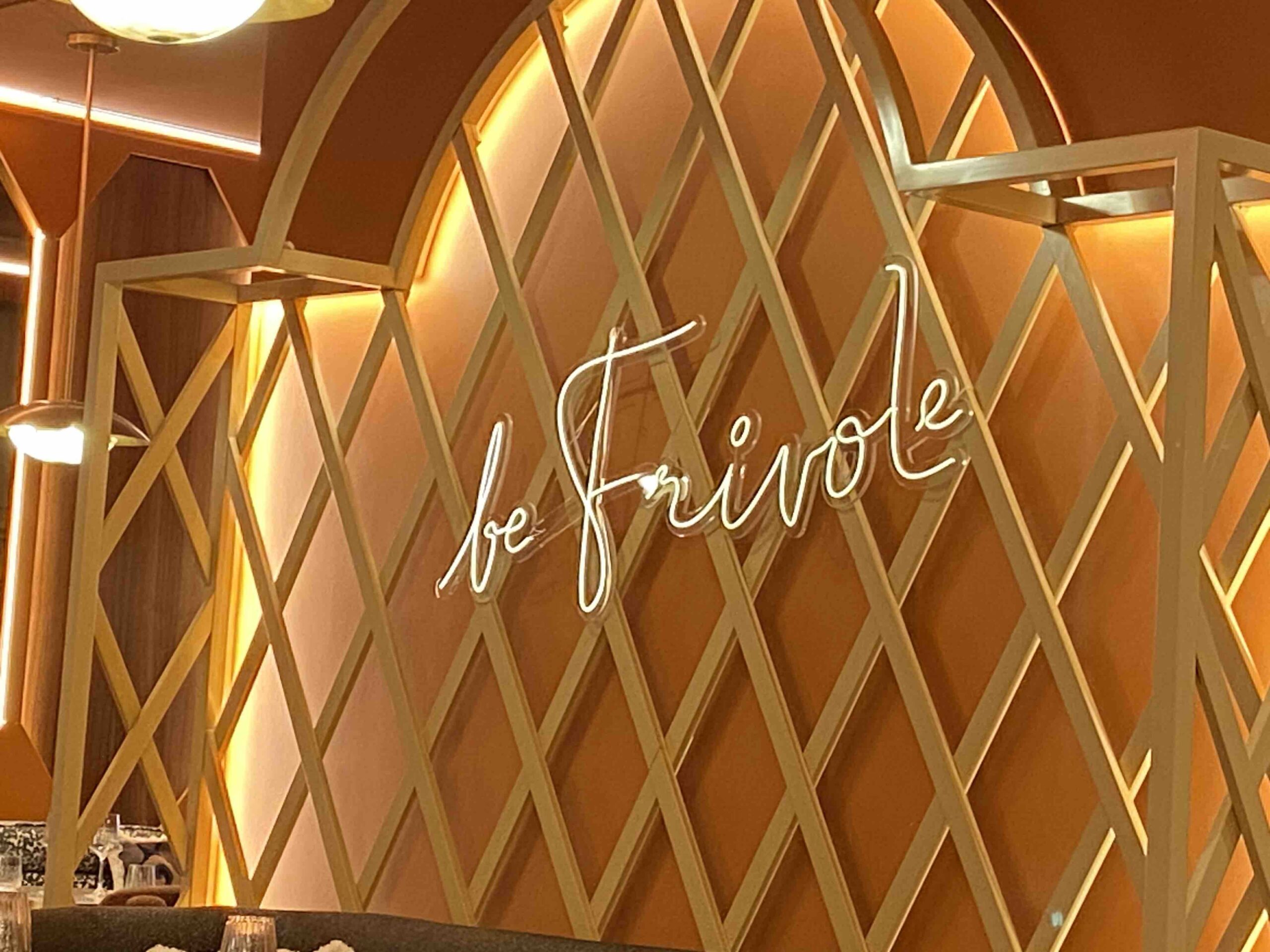 Vues à déjeuner, l’atmosphère et la décoration du lieu m’ont bien plu : elles sont séduisantes, car chaleureuses, féminines dans leurs teintes douces (rose poudré, greige, or, camel). Et l’ouverture sur un puits de lumière arboré est très reposante. Mais je pense que le soir le lieu s’électrise bien plus avec un premier round dans le bar fumoir, puis le repas sous les lueurs des néons qui incite aux sens avec la mention « be Frivole ».
