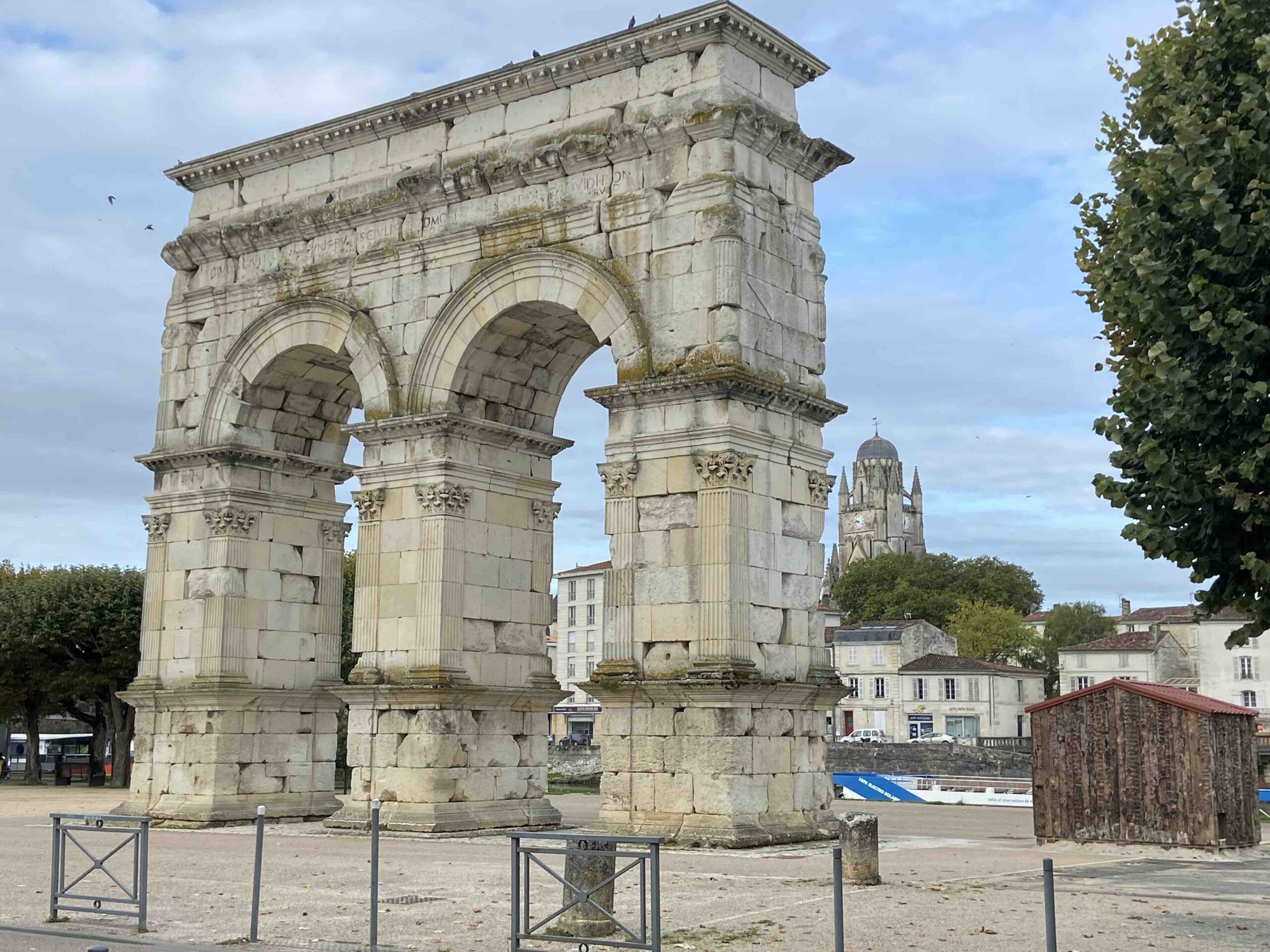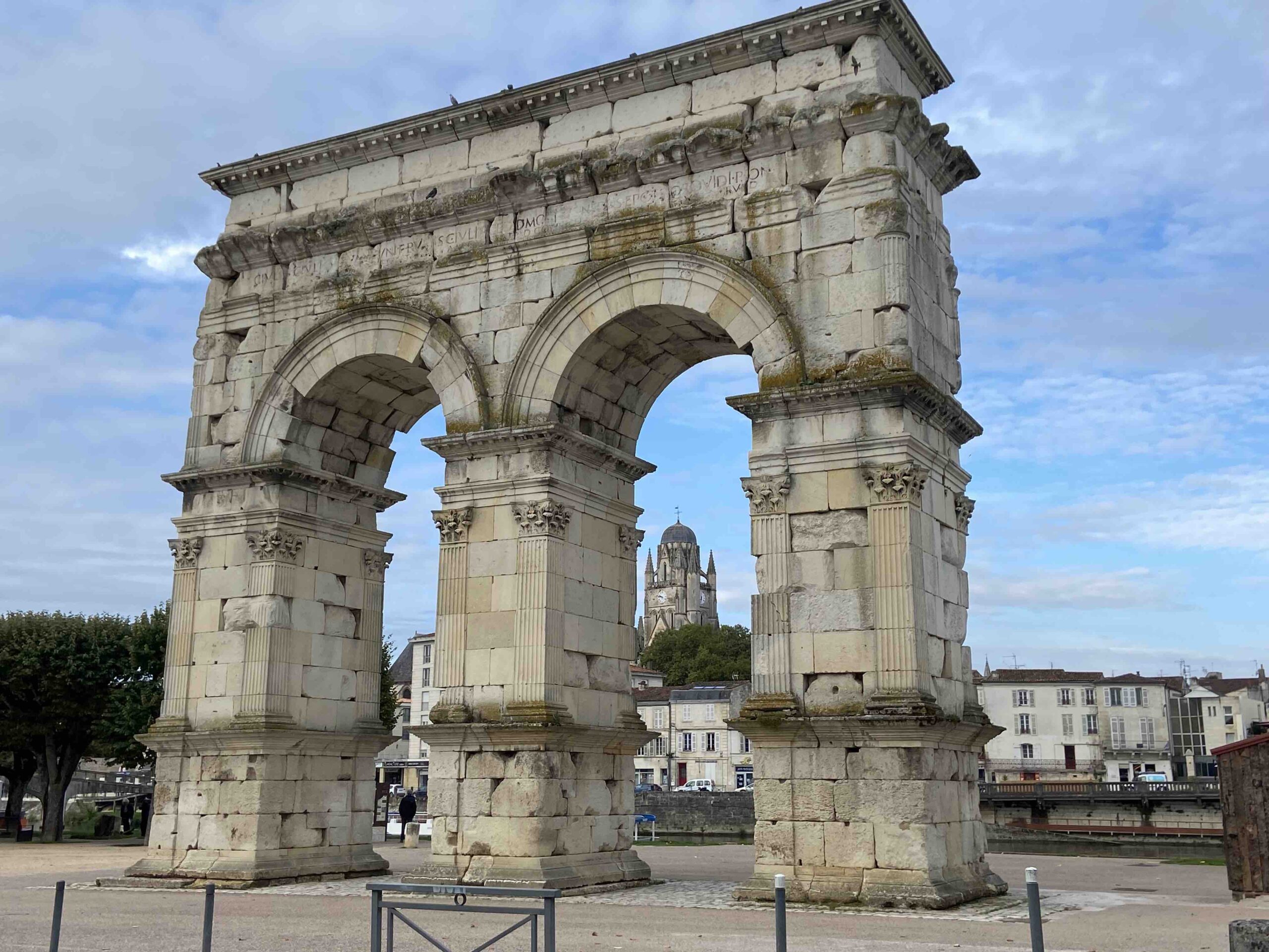 Symbole de la ville qui est omniprésent dans la communication (l’arc est un peu la Tour Eiffel de Saintes !), cet arc n’est pas un arc de triomphe au sens romain du terme où le chef de guerre triomphant passait sous l’arc pour entrer dans la cité avec ses prisonniers de guerre ; mais un axe routier avec 2 ouvertures. Construit sous Tibère vers 18-19, il aurait dû prendre ce nom là ; mais seul le nom de Germanicus, fils de Tibère, demeurait dans les inscriptions mise à mal par le temps ; ce qui fait que les Saintois l’ont baptisé arc de Germanicus.
