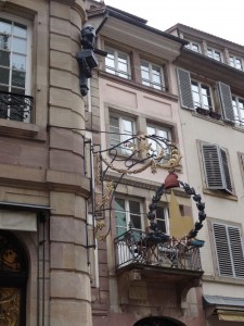 Sur la place de la cathédrale, l’ancienne pharmacie du Cerf est devenue une boutique de souvenirs ; mais le Büchmesser, pilier sur lequel repose l’encorbellement, demeure et cela depuis 1567.