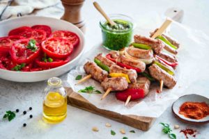 Brochette de chipolatas de porc aux poivrons et pesto maison