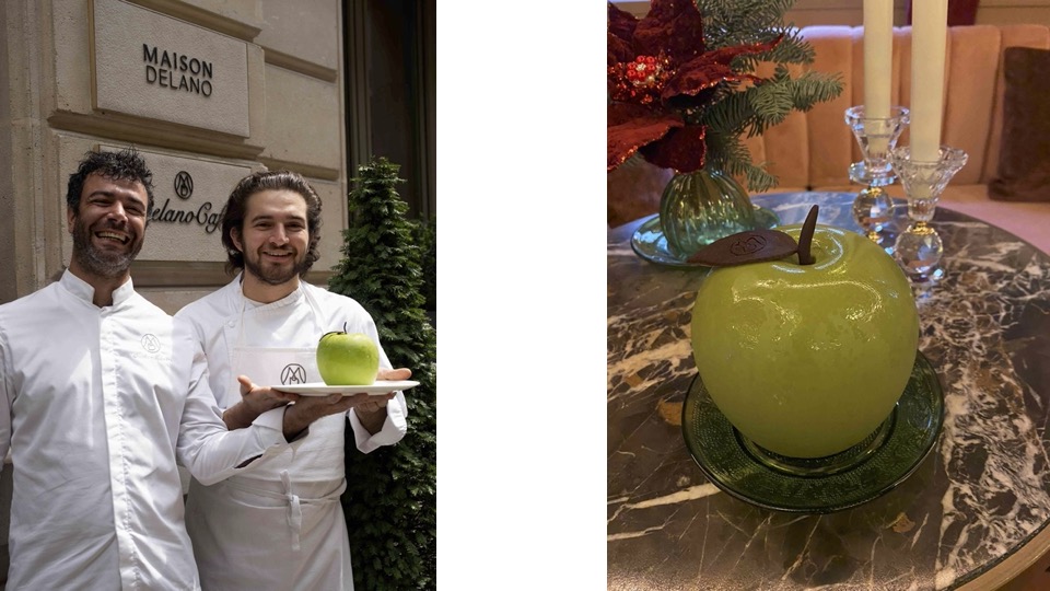 La bûche reprend le logo de l’hôtel, à savoir une pomme et on pourrait aisément dire que sous ce superbe dessert il y a du Cédric Grolet dans l’air. Pas du tout cette bûche très artistique et bonne est le fait des chefs Paolo Minelli et Enzo Ohayon qui sont tous deux passés par de grandes maisons et ont travaillé pour de grands noms comme le Hyatt Vendôme, Piège et Jeffrey Cagnes.