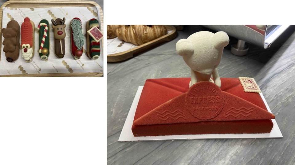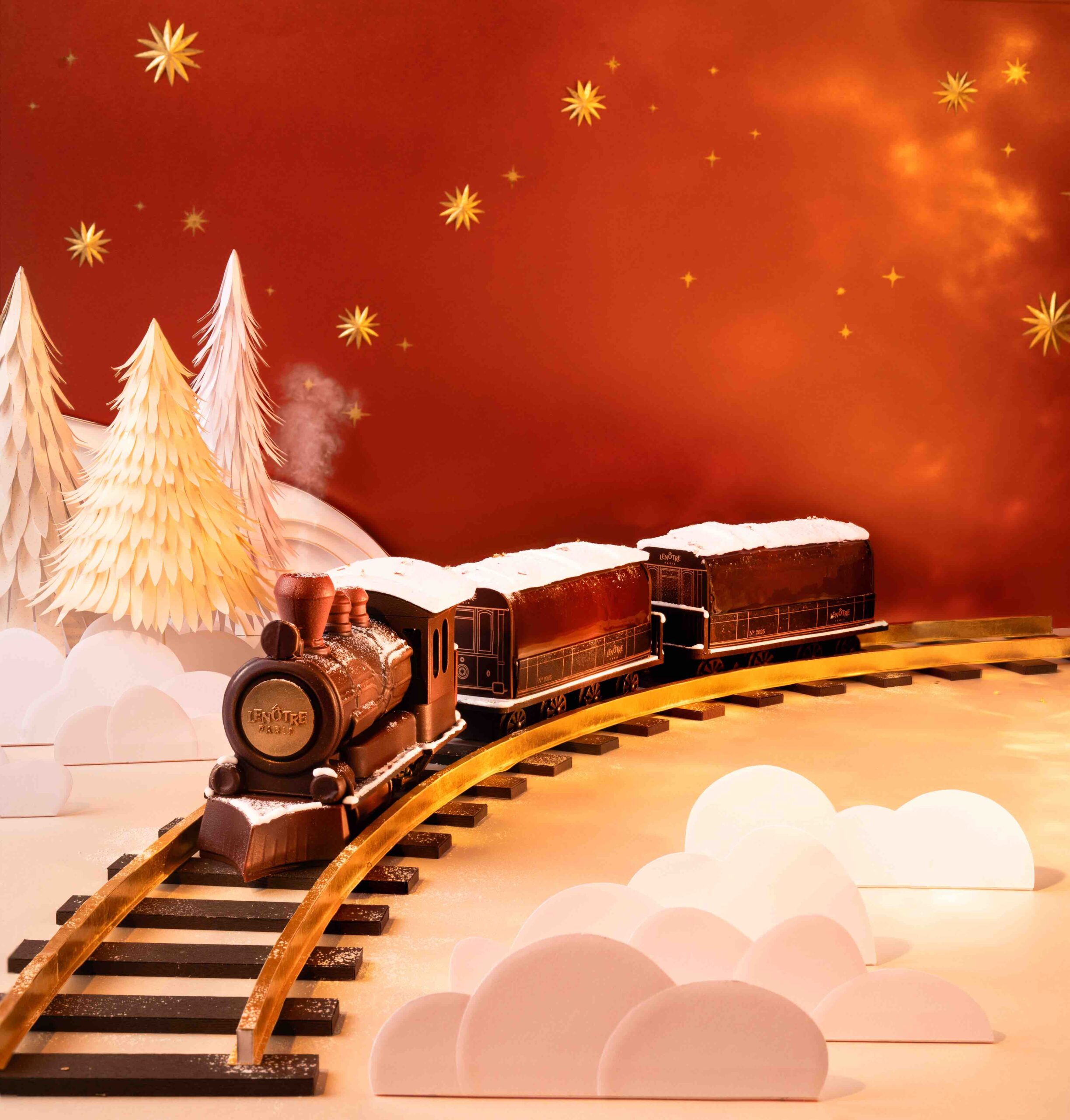 Aux côtés des bûches classiques (choco-caramel, marron-vanille, agrumes-vanille, framboise-vanille, noisette-caramel) ; son train-bûche nous entraîne dans des paysages enneigés de noisette, de grué de cacao, de crémeux au chocolat noir, de mousses cacaotées lait, praliné.