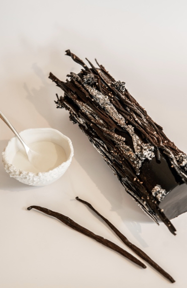 Et le chef, Rémi Chambard et son pâtissier Baptiste Vial de nous proposer une bûche-fagot très gourmande qui nous entraîne en pleine nature et évoque les écorces et les branchages de l’hiver.