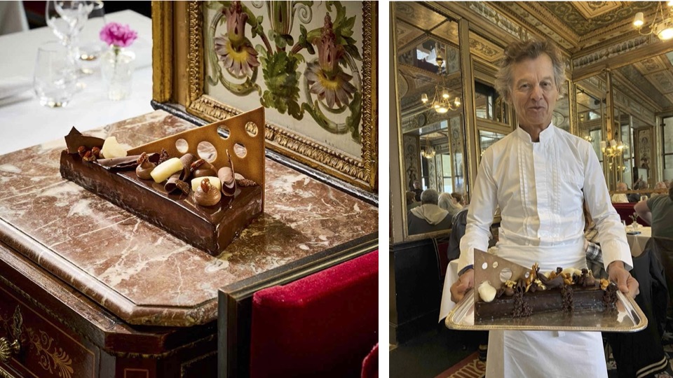 Guy Véfour présente lui-même sa bûche Symphonie d’hiver dont la forme très graphique étonne.