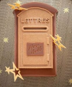 Comme tous les enfants il écrit sa lettre au Père Noël et sous la coque rouge de l’enveloppe se cachent un sablé, un biscuit de Gênes framboisée, un confit de framboises, de la mousse et des litchis.
