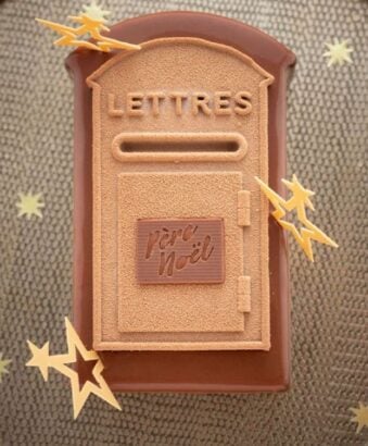 Cette boite à lettres là devrait contenir des missives en provenance de Dubaï ? En tous cas, l’intérieur de la bûche joue la tendance ‘chocolate Dubaï’ avec une dacquoise pistache, un crémeux et un praliné pistache, une mousse au chocolat lait.