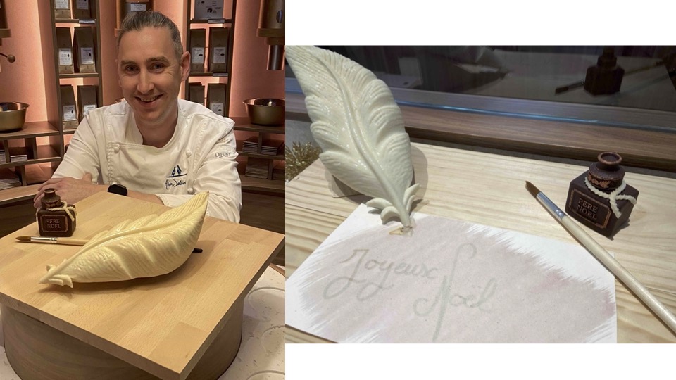 Chaque année, le chef pâtissier, Adrien Salavert, propose un dessert original pour fêter Noël. Il y a déjà eu sa ‘boîte à lettres’, ‘Ceci est un sapin’, sa ‘ nuit de Noël’. Cette année c’est une plume et son encrier (allusion aux plumes de l’oiseau et au fait que Libourne est le centre de réception des lettres écrites au Père Noël !) qui vont vous émerveiller.
