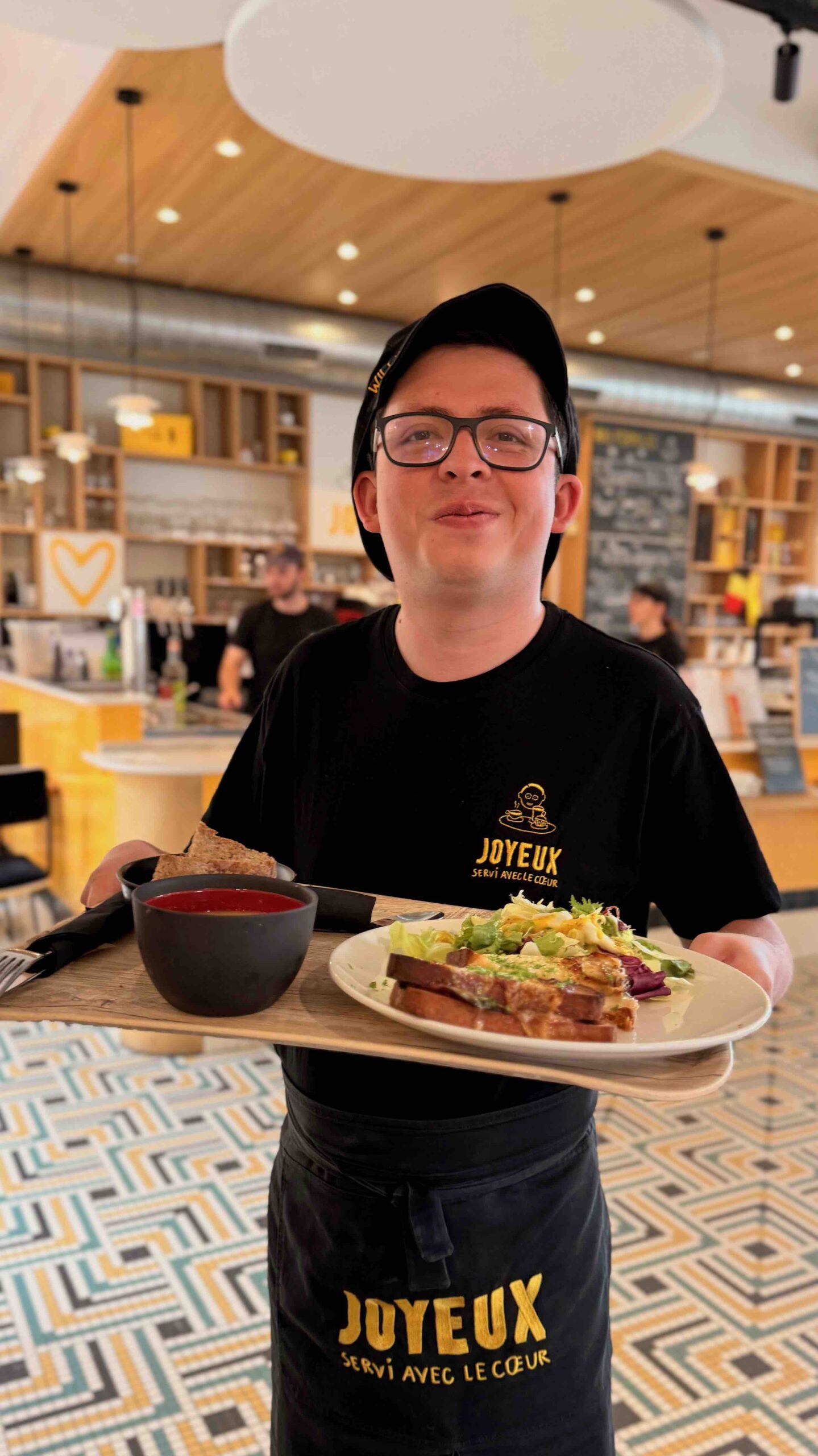 Le concept du lieu : être différent des autres cafés et pourtant vouloir s’assimiler totalement à eux. En dialoguant avec la direction, j’apprends que Café Joyeux initié en France à Rennes en 2017 et ouvert en Belgique fin 2022 a pour but l’inclusion de la fragilité dans le monde actuel via le travail et les échanges.